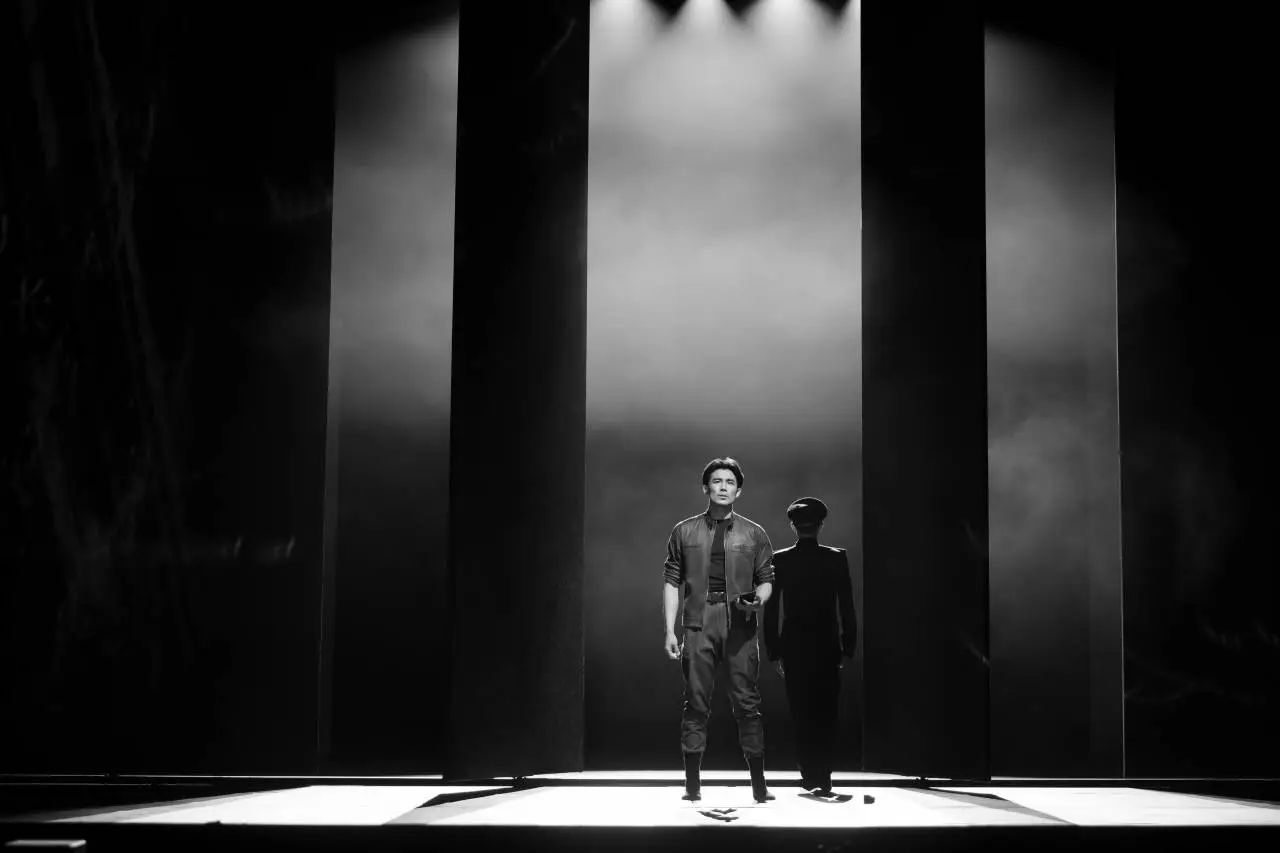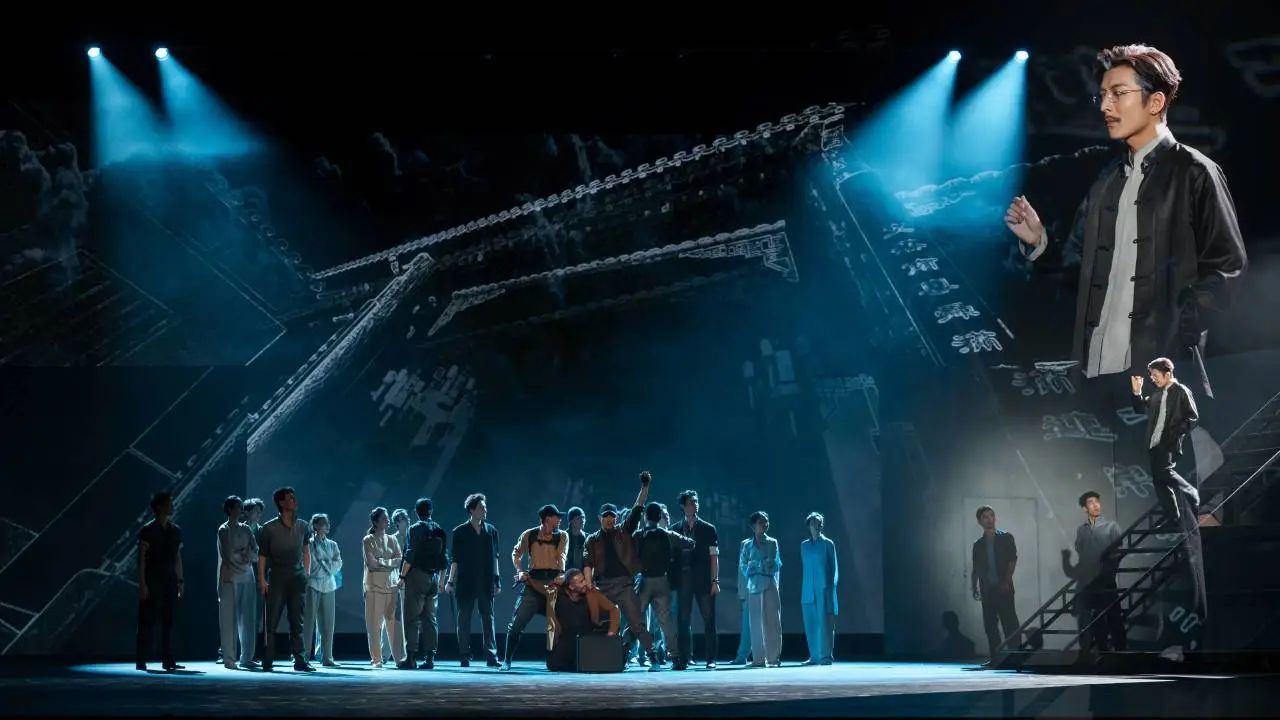 由上述终场的意象和心声可以看出,以黄云松、王圳冰为导演的主创团队坚定从内容出发的原则,将身体语言提升到整体视觉式样感知的高度,从而使并不稀见的身体语言形成了新奇的叙述逻辑。换言之,提升到整体视觉式样感知高度的“身体语言”,在舞剧《破冰》的形态建构,不仅仅具有“语言”的效用而且具有了“结构”的功能。虽然该剧根据电视剧《破冰行动》改编,但为了让大多数并不熟悉剧情的观念迅速形成自己的“预测功能”,该剧由六大块条幅组成“二道幕”的背景,通过条幅选择性旋动而形成的区隔空间,分三组推出了舞剧的主要人设:一组当然是男主李飞和他的父亲赵嘉良;一组是马云波和他的妻子于慧;还有一组则是林耀东和他的爪牙林豹。通过三组人设简练的动态和凝练的神态,让观众迅速捕捉到其间差异化的性格特征,也让观众迅速启动对剧情的“预测功能”。实际上,这样的一个“开场”,不仅通过主要人设让观众去预测舞剧冲突的构成,而且让观众有可能去预测舞剧叙述的表意形态。应该说,该剧表意形态的建构与舞美设计刘科栋、王玥琛也是密不可分的。