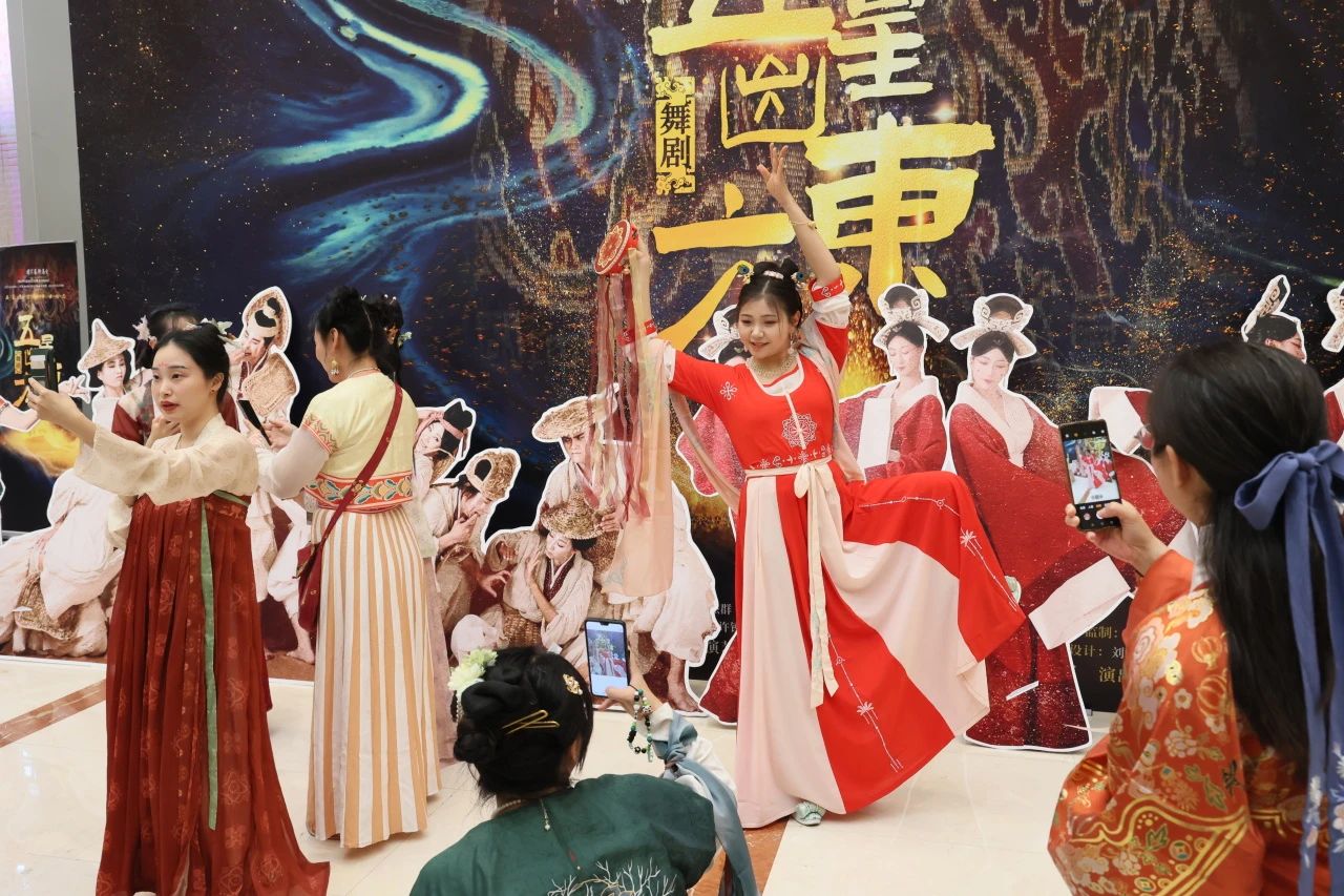 剧场大厅内,10余位身着汉服走动的男女格外显眼,这是北京演艺集团为此次演出特别设计的汉服巡游环节,不仅是为了呼应剧中所呈现的大汉风情,也希望借由汉服之美向更多的观众传播、展现中华优秀传统文化的风采魅力,引得现场观众纷纷拍照合影。