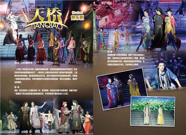 由旷达(文化部王海平部长)编剧的音乐剧《天桥》,讲述一个有着舞台剧梦想的“燕舞台”的老板林鹏飞,想通过自己的系列创新,让自己的“燕舞台”在天桥鹤立鸡群。在竞争中成为业界翘楚。但是,困境连绵,理想曲折,深爱他的妻子金环,又被别人所爱,苦闷中,他企图通过对另外一个女人银环的爱摆脱苦闷,改变精神状态。这种做法又带来爱妻金环的绝望和苦闷。常逛天桥的报馆记者少爷爱袁培文,爱上金环,却无法带金环离开林鹏飞,于是间,爱恨情仇,痛苦纠缠,各自只能埋藏深爱。恰逢时代风云际会,伴随辛亥革命的爆发,新思潮开始冲击这年轻人。他们的梦想与追求,将随新时代大幕的开启,而出现解决的可能。