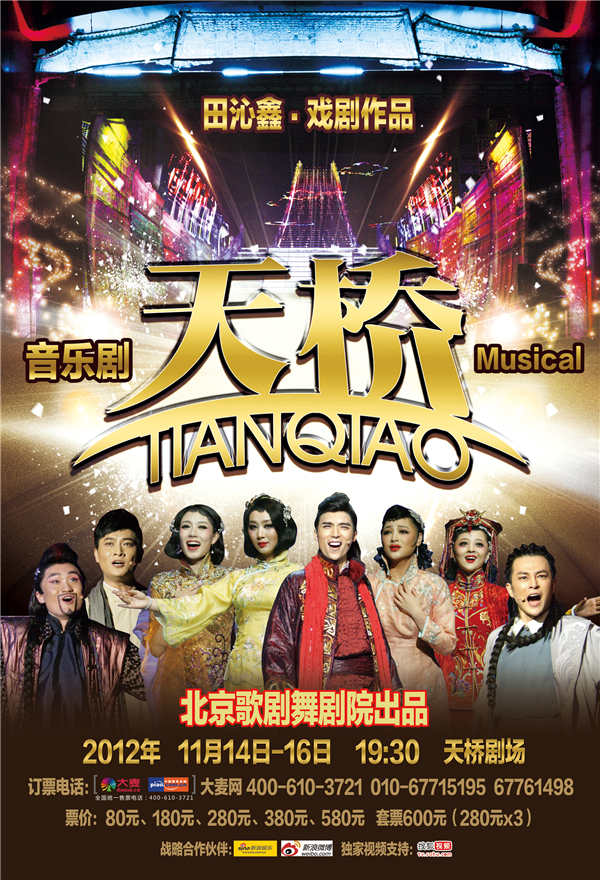 中国国家话剧院最具实力和社会影响力的著名女导演田沁鑫,在继中央电视台电影频道打造大型多媒体音乐剧《电影之歌(2010版)》导演大获成功攻之后,近期再度牵手音乐剧,携手北京歌剧舞剧院,打造她的第三部原创大型音乐剧《天桥》。该剧将于2012年9月16日亮相国安剧场。音乐剧《天桥》将会被田沁鑫打造成“带有梦幻的娱乐之城”质感的天桥,在风云际会的时代背景下,年轻人在新思潮的冲击下,上演炽浓炽热的爱情戏码,艺术与梦想将在“娱乐城”中展开狂放的追求。“天桥”是北京著名的地标,清末,曾经真有此桥,皇帝到先农坛、天坛祈福,必须途径此桥。当时的天桥,荷叶田田,商铺林立,气象活泼。带有独特的“京城艺术区”的独特的文化色彩。导演提出:用现代材料找寻天桥,用今日娱乐再现天桥。完全打破观众对天桥固有的陈旧印象。连接过去、现在和未来。将是这一部原创音乐剧《天桥》独有的气质。