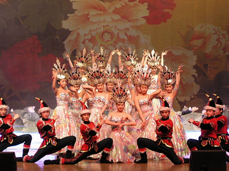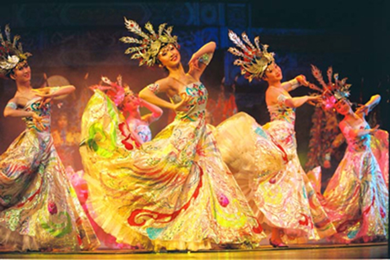 盛唐时期,飞天女伴随着宫廷中笛萧琴瑟引导出人间天上的丝绸之路,霓裳羽衣雍容华贵,西域的乐曲和旋转的胡人潇洒豪迈,唐代仕女盛装上场,衬托出大唐盛世祥和、富丽堂皇的千古盛景。
